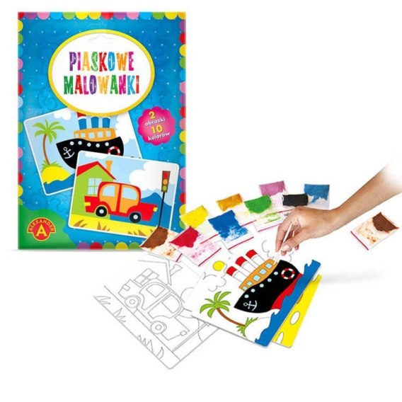 Zestaw zawiera: - 2 obrazki- statek i samochód, - papierową podkładkę, - instrukcję - patyczek, - 22 woreczki z kolorowym piaskiem (11 kolorów),