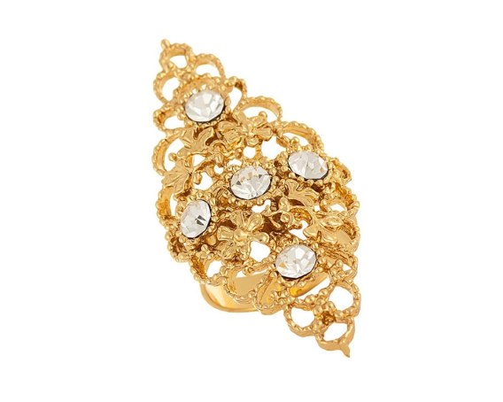Pozłacany, ażurowy pierścionek, zdobiony kryształkami Preciosa. Pierścionek regulowany