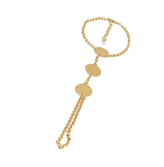 Bransoletka pozłacana z łańcuszkiem na palec, ozdobiona monetkami. Długość 16,0 cm + 4,0 cm przedłużka, długość spływających monetek 14,0 cm. Średnica monetki 1,5 cm. Waga bransoletki 10,0 g.