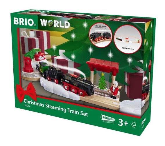 Zabawa zestawami pociągów i pojazdów Brio pomaga dziecku poznać i zrozumieć świat, w którym żyje, rozwija jego wyobraźnię, kreatywne myślenie i umiejętności manualne. Świąteczny Zestaw z kolejką na parę na baterie jest bożonarodzeniowym pakietem dedykowanym dzieciom od 3. roku życia. Opakowanie zawiera dwadzieścia sześć klocków, w tym kilka wagonów, żurawia i świąteczny przystanek.