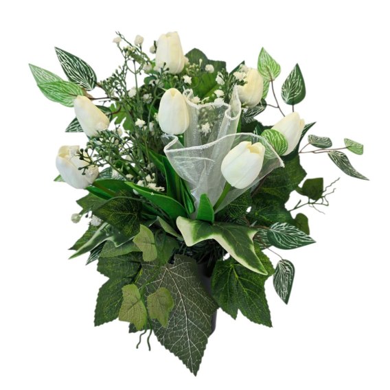 Bukiet flakon stroik na cmentarz kompozycja kwiatowa na grób tulipany