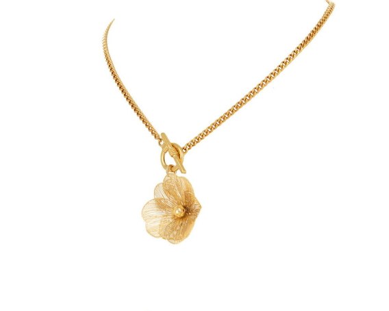 Pozłacany choker z pięknym, trójwymiarowym, ażurowym kwiatem. Długość naszyjnika wynosi 41 cm. Naszyjnik zapinany na zapięcie typu toogle.