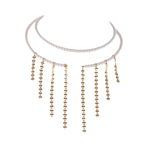 Delikatny, elastyczny i pełen blasku choker wykonany z satynowych perełek, które subtelnie odbijają światło, tworząc elegancki i kobiecy efekt. Całość uzupełniają finezyjnie opadające łańcuszki, dodające biżuterii lekkości, ruchu oraz nuty nowoczesnej zmysłowości. Ten wyjątkowy dodatek pięknie podkreśla szyję i sprawdzi się zarówno w codziennych stylizacjach, jak i w wieczorowych zestawach wymagających efektownego akcentu.