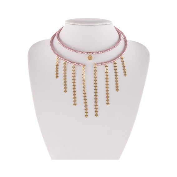 Choker z satynowych, różowych perełek, z wiszącymi łańcuszkami (C25/MEM/28AU)