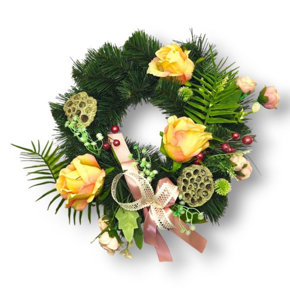 Nasz wieniec pogrzebowy cechuje się wyjątkowo gęstym splotem sztucznych gałązek iglastych, które tworzą estetycznie wyglądające tło dla unikalnej kompozycji kwiatów. Starannie dobrane kwiaty są niezwykle realistyczne i naturalne, dodając wiązance autentyczności i podkreślając jej uroczysty charakter.