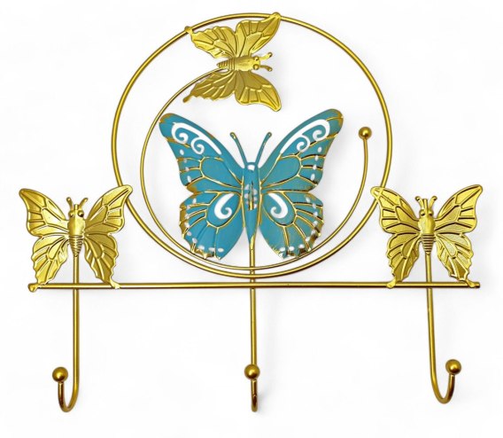 Ten elegancki wieszak ścienny to idealne połączenie funkcjonalności i stylu, doskonale wpasowujące się w każde wnętrze. Wykonany z metalu w złotym odcieniu, wieszak zdobią pięknie wyprofilowane motywy motyli. Centralnym elementem kompozycji jest duży turkusowy motyl z delikatnymi zdobieniami, otoczony trzema mniejszymi złotymi motylami. Wieszak posiada trzy praktyczne haczyki, umożliwiające zawieszenie kluczy, biżuterii, ręczników lub innych drobnych przedmiotów.