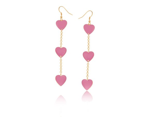 Pozłacane kolczyki z ręcznie malowanymi na różowo serduszkami na haczykach. Długość kolczyków ok 11 cm.