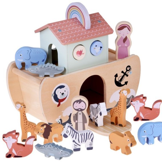 W zestawie znajduje się solidnie wykonana arka oraz drewniane figurki zwierzątek i postaci, dzięki którym maluch może odgrywać biblijną historię lub wymyślać własne przygody.