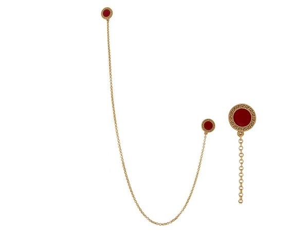 Pozłacane, ręcznie malowane na czerwono piny z motywem drogi greckiej połączone ze sobą łańcuszkiem typu rolo. Średnica pinu 1,8 cm. Długość łańcuszka 46 cm.
