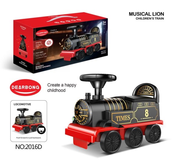 Interaktywny jeździk - lokomotywa retro z efektami dźwiękowymi i świetlnymi to propozycja dla dzieci od 3-go roku życia. Zabawka wykonana została z wysokiej jakości, wytrzymałego i nietoksycznego tworzywa sztucznego. Lokomotywa posiada 6 kół w tym dwa przednie skrętne. Pod siedzeniem znajduje się schowek na skarby dziecka. Zabawka zasilana jest bateriami typu 2 x 1,5V AA, w zestawie brak baterii. W kierownicy umiejscowiono przycisk uruchamiający odgłosy jazdy lokomotywy oraz kolorowe migające światełka. Boki lokomotywy wyposażono w  wysuwane podnóżki dla dziecka.