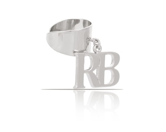 Posrebrzana, klasyczna, gładka obrączka , z wiszącymi literkami RB. Wielkość literek 2,5 cm/ 1,7 cm. Obrączka regulowana.