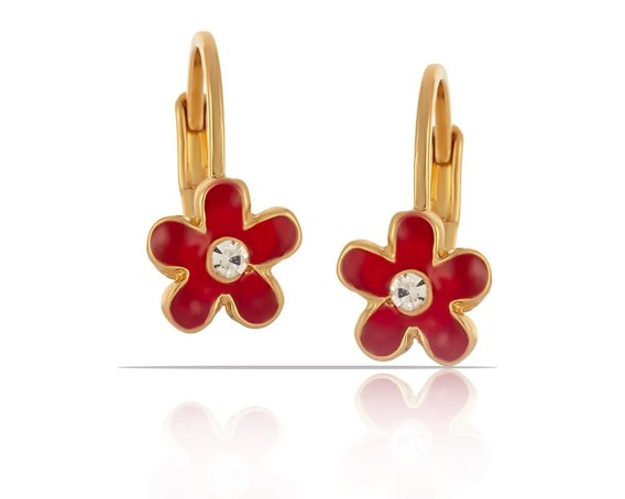 Pozłacane, ręcznie malowane na czerwono kolczyki kwiatuszki, zdobione kryształkami Preciosa. Długość kolczyka ok 1,8 cm.