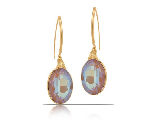 Pozłacane kolczyki z dużym, mieniącym się kamieniem Crystal Cappuccino DeLite Primero. Długość kolczyka 7,3 cm. Wymiary kamienia 3 cm/ 2 cm.