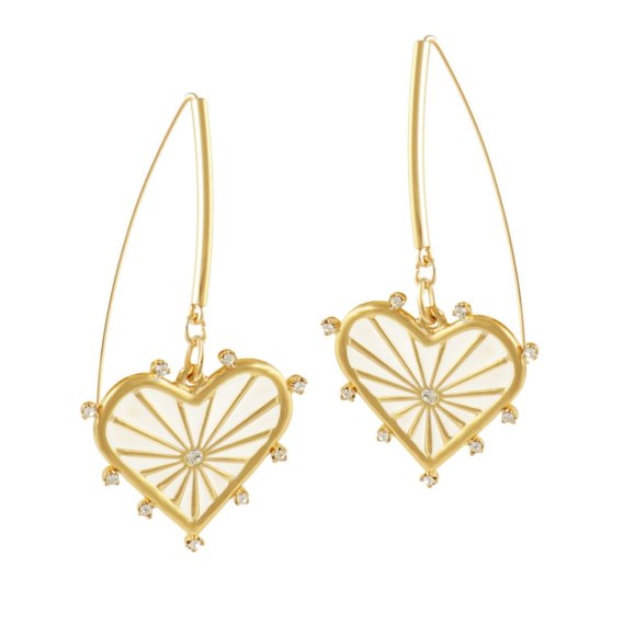 Pozłacane kolczyki Colibra by Sviatlana z kolekcji BELLA, z ręcznie malowanymi, białymi sercami, zdobionymi kryształkami Preciosa. Długość kolczyków ok 6,5 cm