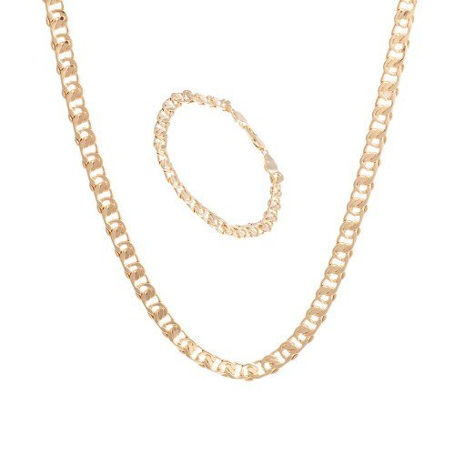 Komplet pozłacany, spłaszczone ogniwa. Wymiary: łańcuszek ( 22,0x 0,7 cm), bransoletka ( 20,0 x 0,7 ). Warstwa złota naniesiona w metodzie - PVD- napylanie próżniowe jonami tytanu, czy też azotkiem tytanu jest nowoczesną metodą nanoszenia powłok o bardzo dużej trwałości. * Pokryte jest w całości 4 - 8 mikronową warstwą 14K, 18K i 24K złota. * Warstwa złocenia pokryta jest lakierem jubilerskim, który zabezpiecza powłokę złota przed ścieraniem i nadaje wspaniały połysk * Biżuteria wykonana ze stali szlachetnej-należy do grupy stali o strukturze austenitycznej ( podobna chirurgiczna 316 L) : - jest hipoalergiczna i nie uczula, ponieważ nie emituje związków niklu do organizmu - nie koroduje, nie odbarwia się i długo cieszy swoim blaskiem - ścieralność uzależniona od noszenia i od pH ciała - nie wymaga specjalnej konserwacji jak biżuteria ze srebra, czy złota Ze względu na różne ustawienia monitorów oraz różną jakość wyświetlaczy zastosowanych w urządzeniach mobilnych, kolory przedstawione na zdjęciach mogą nieznacznie różnić się od rzeczywistych. Dokładamy wszelkich starań, aby na stronie Sklepu przedstawiać tylko realne zdjęcia produktów, jak najbardziej zbliżone do rzeczywistości.