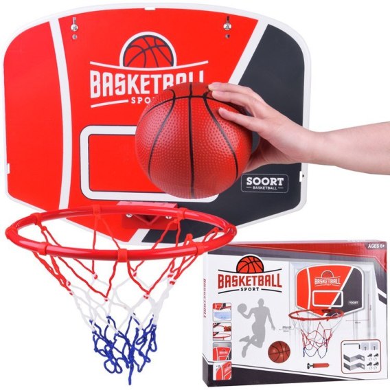 Zestaw zawiera: - tablica z metalową obręczą - siatka 3 kolorowa - uchwyty do tablicy - pompka do napompowania piłki - piłka