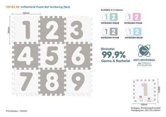 Edukacyjne, antybakteryjne puzzle piankowe z cyferkami to propozycja dla najmłodszych od 10-go miesiąca życia. Puzzle wykonano z antybakteryjnego materiału zawierającego jony srebra zapobiegającemu zaleganiu bakterii na powierzchni maty. Formuła Ag+ z jonami srebra, eliminuje 99,9% bakterii i zarazków. Dla utrzymania czystości wystarczy przetrzeć każdy element wilgotną ściereczką.