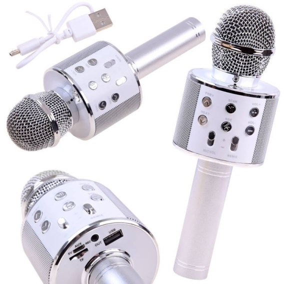 Funkcje przycisków: - PREV - poprzedni utwór - NEXT - następny utwór - SCAN - pauza / wznowienie utworu - REC - modulacja głosu / zmiana - VOL + - podgłaszanie - VOL - - ściszenie - MICVOL - regulacja głośności mikrofonu - REIMX - efekt pogłosu-echa Funkcje mikrofonu: - wzmacnianie dźwięku - możliwość regulacji parametrów : wysokie i niskie tony, głośność, echo, pogłos - regulacja głośności dźwięku z mikrofonu oraz podkładu muzycznego - funkcja samodzielnego głośnika (2 głośniki po obu stronach mikrofonu) - kompatybilny z systemem Android i IOS - wejście micro USB (ładowarka) i USB (pendrive) - wbudowany akumulator - sterownie odtwarzaczem muzyki : przesuwanie przód/tył, pauza/play - możliwość nagrywania śpiewanych piosenek (wymaga pobrania odpowiedniej aplikacji na telefon)