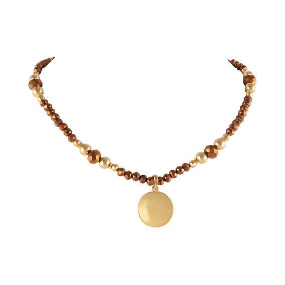 Naszyjnik czekoladowych koralików i złotych kulek z zawieszką w kształcie okrągłego plasterka (C25/KOR/83/1AU)