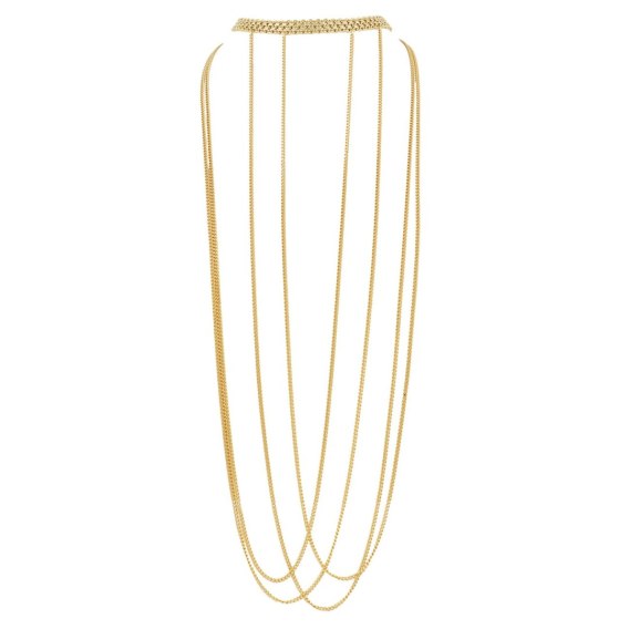 Pozłacany choker" Bismarck" Colibra by Sviatlana z kolekcji Selena, zdobiony łańcuszkami ozdabiającymi ciało.Długość chokera 33 cm + 8 cm