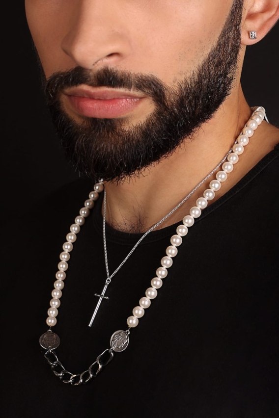 Naszyjnik męski z pereł z wkompowanymi monetami z łańcuchem typu pancerka. Długość naszyjnika regulowana 65 cm z przedłużką 7 cm.