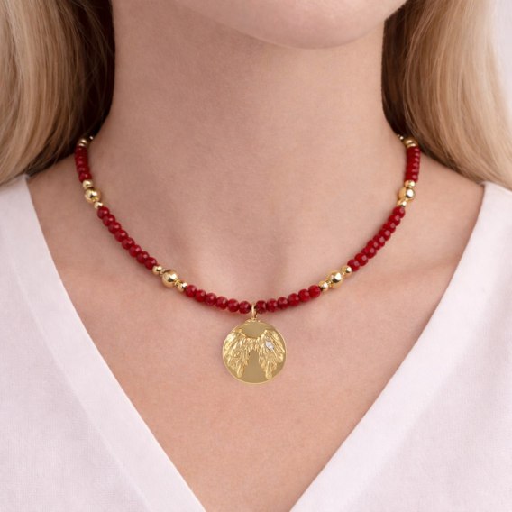 Naszyjnik z czerwonych koralików i złotych kulek z plasterkiem, ze skrzydłami (C25/KOR/105AU)