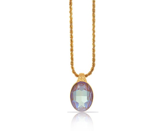 Pozłacany naszyjnik z dużym, różowym, mieniącym się kamieniem Crystal Cappuccino DeLite Primero. Długość naszyjnika 45 cm + 8 cm przedłużki. Wymiary zawieszki 3,5 cm/ 2 cm.