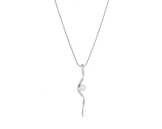 Bardzo elegancki i nowoczesny naszyjnik z perłą. Długość łańcuszka 45cm, grubość 0,1cm. Zawieszka długość 6,2cm, szerokość 1cm. Naszyjnik posrebrzany.