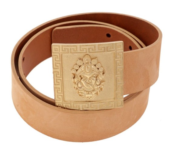 Najnowsza kolekcja! Skórzany pasek z ręcznie tworzoną, kwadratową klamrą pozłacaną. Motyw hinduskiej bogini Kali. Długość 90cm, szerokość 3,3cm, klamra 5,2cm x 5,2cm, grubość 0,3cm.