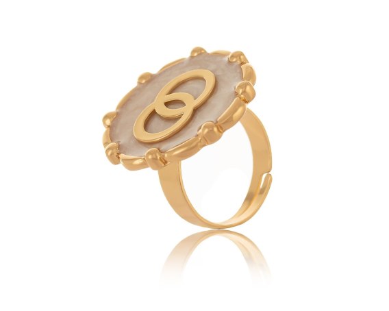 Pozłacany, ręcznie malowany na perłowo pierścionek z kółkami w środku. Pierścionek posiada regulację. Średnica ozdoby ok 2,3 cm.