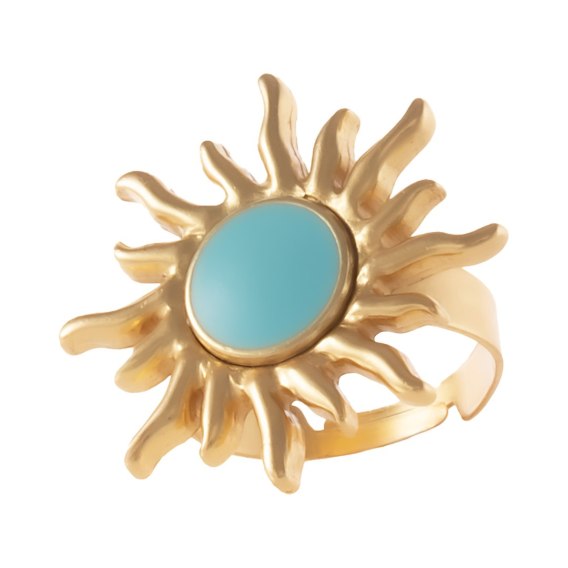 Dodaj odrobinę słońca do swojej biżuterii! Ten wyjątkowy pierścionek w kształcie słoneczka to połączenie artystycznego rzemiosła i niepowtarzalnego stylu. Ręcznie malowany turkusową emalią, zachwyca swoją intensywną barwą i subtelnym połyskiem. Regulowana obrączka sprawia, że idealnie dopasuje się do każdego palca - bez względu na rozmiar.