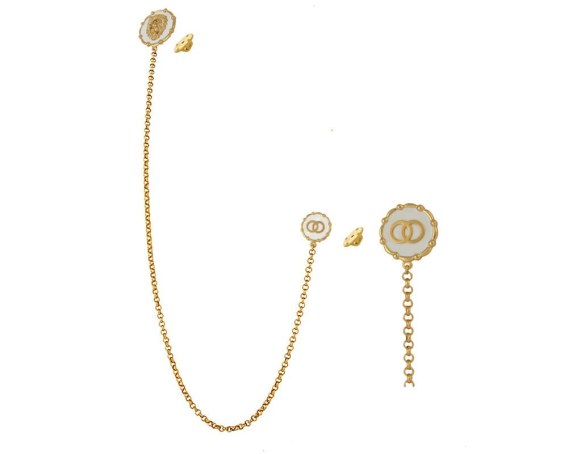 Pozłacana ozdoba składająca się z dwóch ręcznie malowanych na biało pinów, połączonych ze sobą łańcuszkiem typu rolo.