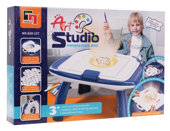 Projektor do malowania dla dzieci od 3-go roku życia. Projektor zaprojektowano w kształcie stoliczka. Zestaw zawiera 12 krążków z 4 slajdami. Wystarczy włożyć krążek i kolorowy slajd pojawi się na górze stoliczka do malowania. Następnie dziecko kładzie kartkę na stoliczku i obrysowuje wyświetlany obrazek. W zestawie znajdują się również kolorowe pisaki do malowania.Zabawka zasilana jest bateriami typu 3 x AA 1,5 V (brak w zestawie).