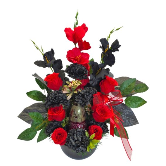 Stroik na cmentarz ze zniczem kompozycja kwiatowa miska z obciążeniem
