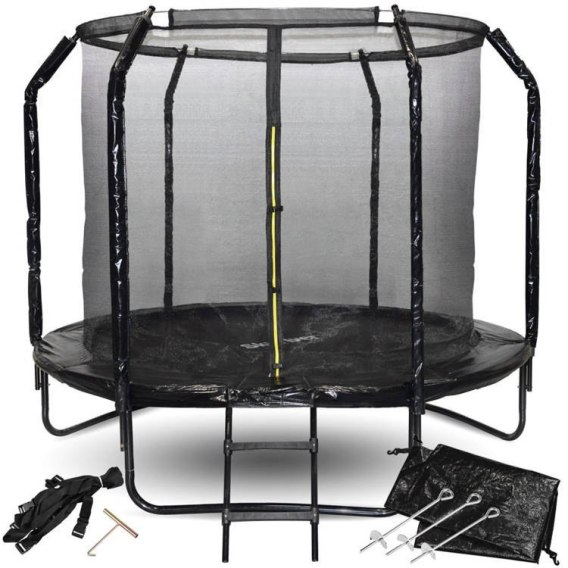 Zestaw zawiera: - trampolina stojąca z malowanymi na czarno rurkami - drabinka - siatka zabezpieczająca - sznurek do mocowania siatki - kotwy z pasami - wodoodporny pokrowiec - pad - osłona na sprężyny - klucz do naciągania sprężyn - instrukcja montażu w języku Polskim