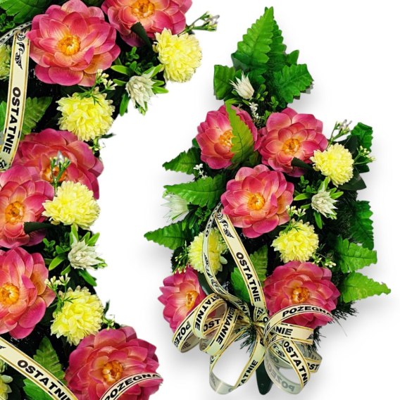 Kwiaty są integralnym elementem ceremonii ostatniego pożegnania lub jako element ozdobienia grobu, łącząc szacunek i elegancję w jednym, starannie wykonanym projekcie. Podkład wieńca jest wykonany z zielonych, gęsto splecionych gałązek PCV, które są zarówno trwałe, jak i estetyczne, podkreślając kolorystykę wiązanki.
