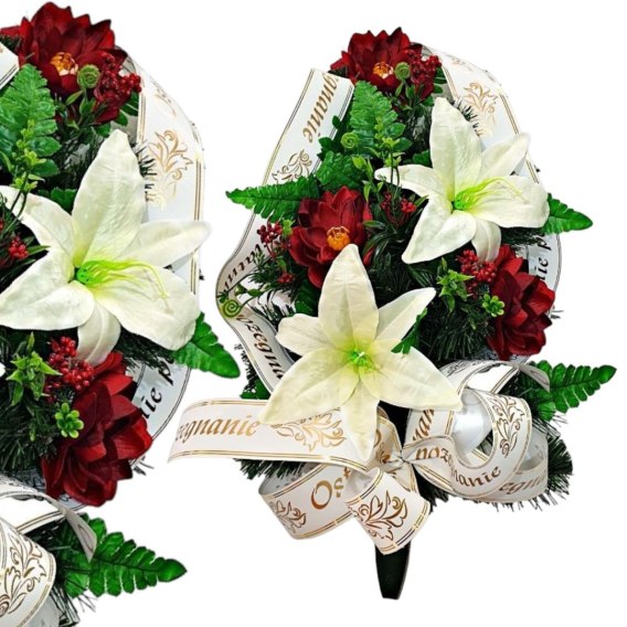 Wiązankę cechuje gęsty splot sztucznych gałązek iglastych, które tworzą estetycznie wyglądające tło dla unikalnej kompozycji kwiatów. Starannie dobrane kwiaty są niezwykle realistyczne i naturalne, dodając wiązance autentyczności i podkreślając jej uroczysty charakter.