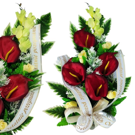 Wiązankę cechuje gęsty splot sztucznych gałązek iglastych, które tworzą estetycznie wyglądające tło dla unikalnej kompozycji kwiatów. Starannie dobrane kwiaty są niezwykle realistyczne i naturalne, dodając wiązance autentyczności i podkreślając jej uroczysty charakter.