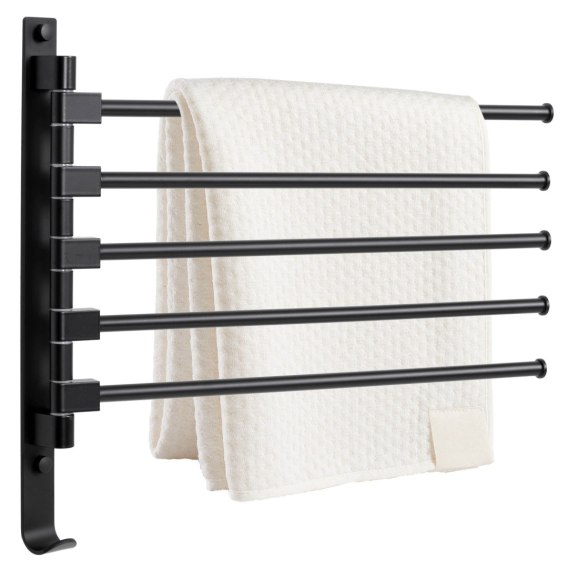 Tyros to praktyczny i elegancki wieszak łazienkowy. Posiada dolny haczyk i aż pięć obrotowych, niezależnych od siebie ramion, które można ustawiać wg uznania lub złożyć całkiem w stronę ściany. Wieszak estetycznie wykonany z materiałów najwyższej jakości z zachowaniem dbałości o najdrobniejsze detale. Całość konstrukcji z aluminium, wykończonego na kolor czarnego matu. Model doskonale sprawdzi się w nowocześnie urządzonych łazienkach. Idealnie pasuje do stylu loftowego.