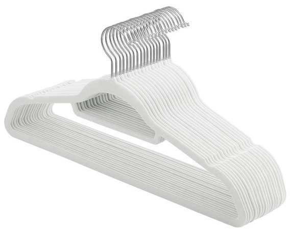 Wieszaki metalowe pokryte miłym w dotyku welurem. Powierzchnia antypoślizgowa zapobiega zsuwaniu się ubrań. Metalowe wnętrze gwarantuje duży udźwig wieszaków- do pięciu kilogramów każdy. Wieszak posiada dwie poprzeczki, mniejsza na dodatki, większa na spodnie. Ramiona z dodatkowymi wcięciami na topy i sukienki o drobnych ramiączkach. Obrotowy hak pozwala zawiesić je wygodnie niemal wszędzie.