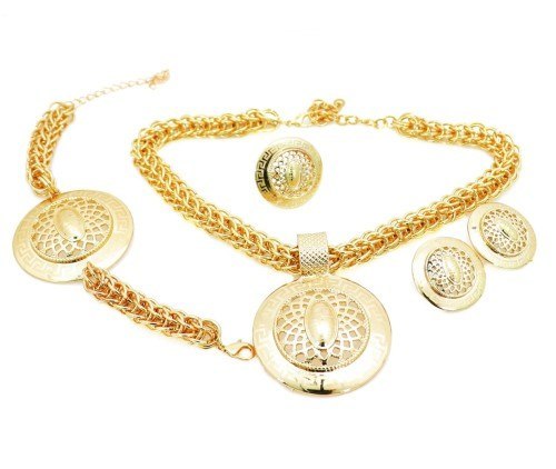 Komplet składa się z naszyjnika, bransoletki i kolczyków. Warstwa złota naniesiona w metodzie electroplated * Pokryte jest w całości 4 - 8 mikronową warstwą 14K, 18K i 24K złota * Warstwa złocenia pokryta jest lakierem jubilerskim, który zabezpiecza powłokę złota przed ścieraniem i nadaje wspaniały połysk * Biżuteria wykonana ze stali szlachetnej-należy do grupy stali o strukturze austenitycznej ( podobna chirurgiczna 316 L) : - jest hipoalergiczna i nie uczula, ponieważ nie emituje związków niklu do organizmu - nie koroduje, nie odbarwia się i długo cieszy swoim blaskiem - ścieralność uzależniona od noszenia i od pH ciała - nie wymaga specjalnej konserwacji jak biżuteria ze srebra, czy złota Ze względu na różne ustawienia monitorów oraz różną jakość wyświetlaczy zastosowanych w urządzeniach mobilnych, kolory przedstawione na zdjęciach mogą nieznacznie różnić się od rzeczywistych. Dokładamy wszelkich starań, aby na stronie Sklepu przedstawiać tylko realne zdjęcia produktów, jak najbardziej zbliżone do rzeczywistości.