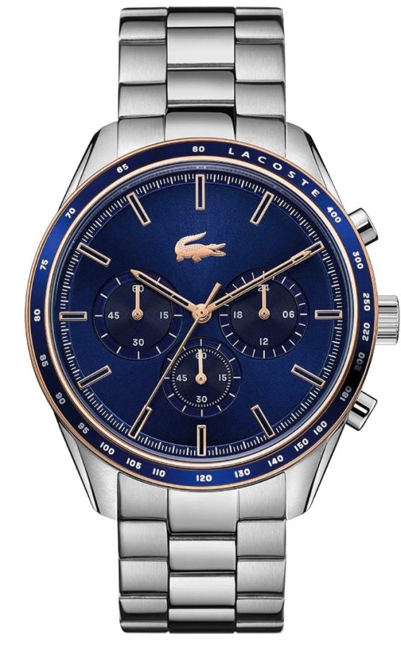 Główna tarcza w głębokim, granatowym kolorze jest centralnym punktem zegarka, przyciągając wzrok swoim wyrazistym odcieniem, który doskonale kontrastuje z miedzianymi detalami. Indeksy są smukłe, liniowe i wykonane w ciepłym, miedzianym kolorze, co dodaje zegarkowi elegancji i ułatwia szybki odczyt godziny. Miedziane wskazówki, w tym centralna wskazówka sekundowa, podkreślają luksusowy charakter zegarka, jednocześnie zapewniając doskonałą widoczność na tle ciemnej tarczy. Delikatne logo Lacoste znajduje się w górnej części tarczy, subtelnie przypominając o prestiżowej marce, bez dominowania nad resztą projektu. Okrągła, precyzyjnie oznaczona podziałka minutowa na zewnętrznym obrzeżu tarczy, w kolorze niebieskim, dodaje zegarkowi technicznego charakteru, co czyni go zarówno eleganckim, jak i praktycznym dodatkiem.