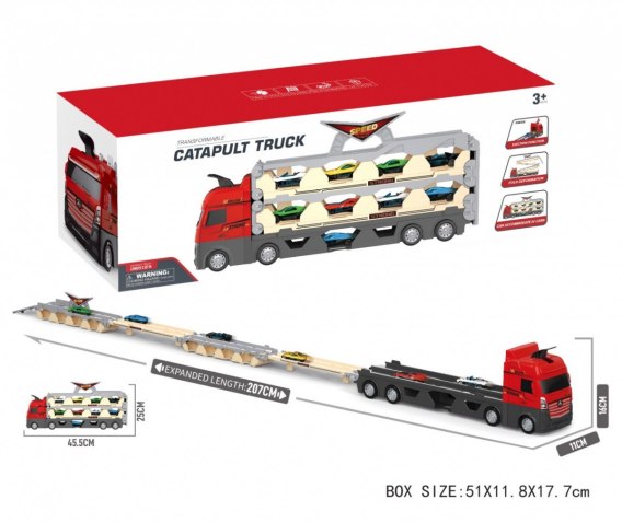 Duży, solidnie wykonany, trzypoziomowy truck z katapultą dla dzieci od 3-go roku życia. Truck posiada gumowe opony oraz napęd na dwa koła. Na górze pojazdu znajduje się wygodna rączka do przenoszenia, by auto zabrać wszędzie ze sobą. Zabawka posiada 3 poziomy, na których można przechowywać dużą ilość resoraków (w zestawie znajduje się 6 autek). Po rozłożeniu kolejnych poziomów powstaje duży tor, dla autek, o długości aż 207 cm. Truck posiada katapultę dla pojazdów, wystarczy umieścić pojazd na najniższym poziomie i wcisnąć dźwignię znajdującą się na dachu trucka. Samochodzik wystrzeli do przodu i pojedzie po rozkładanym torze. Zabawka nie wymaga użycia baterii. Funkcje trucka: - wygodna rączka do przenoszenia, - sorter dla pojazdów, - katapulta dla autek, - napęd na dwa koła.